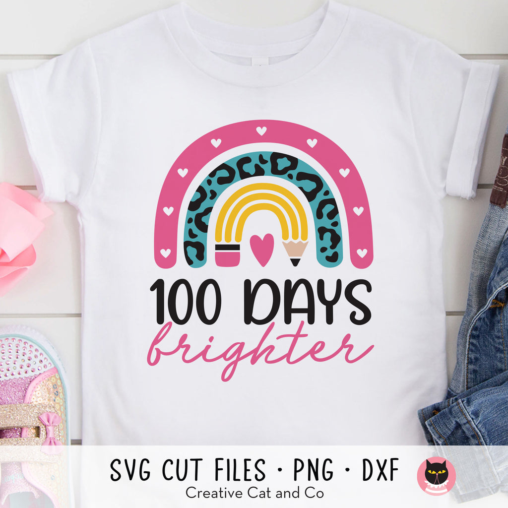 100 Days brighter SVG and DXF cut files. Celebrate 100 days of school with this cute rainbow with pencil and leopard pattern SVG design. Compatible with Cricut and Silhouette. The SVG file is layered and great for making t-shirts for teachers and students. High resolution PNG clipart is also included.