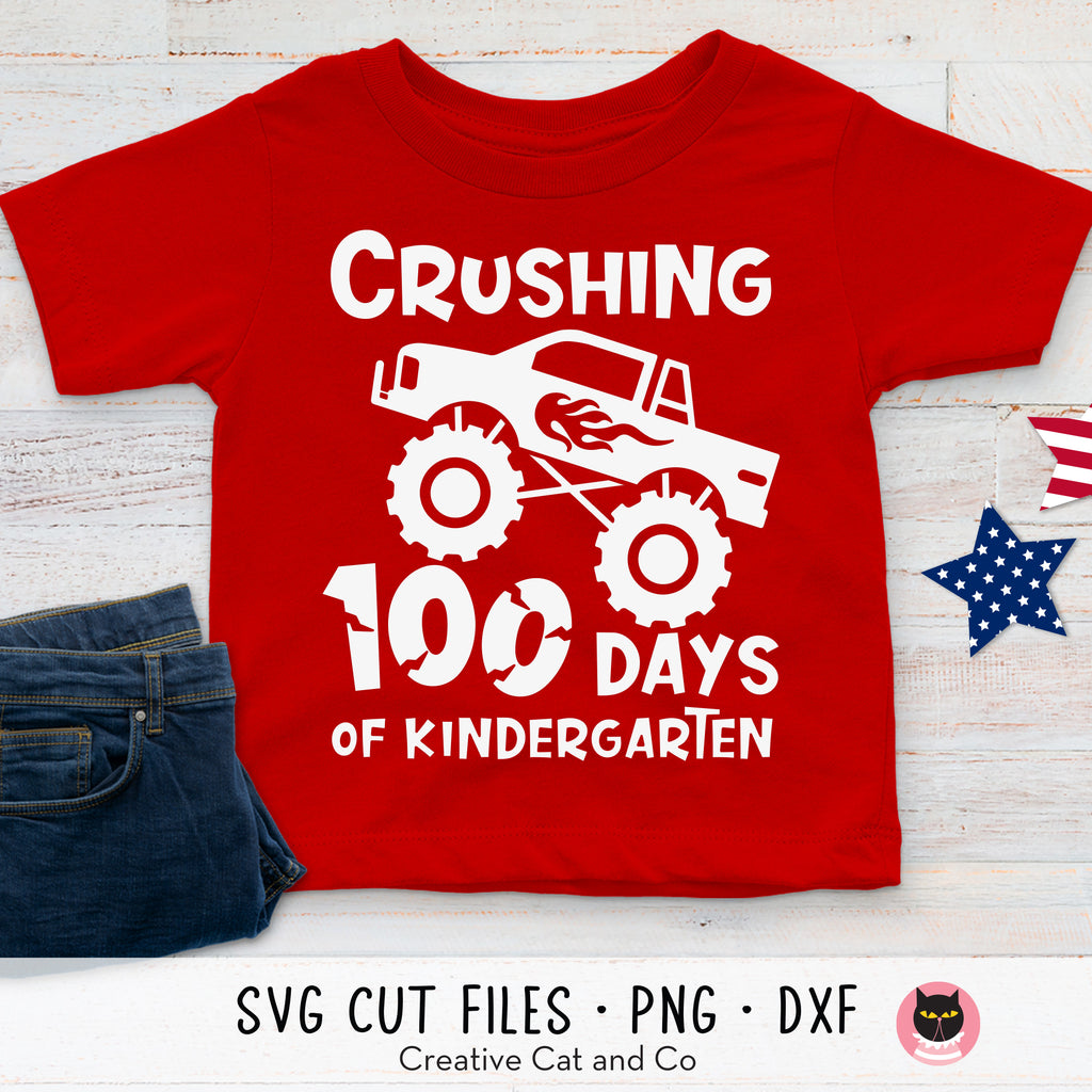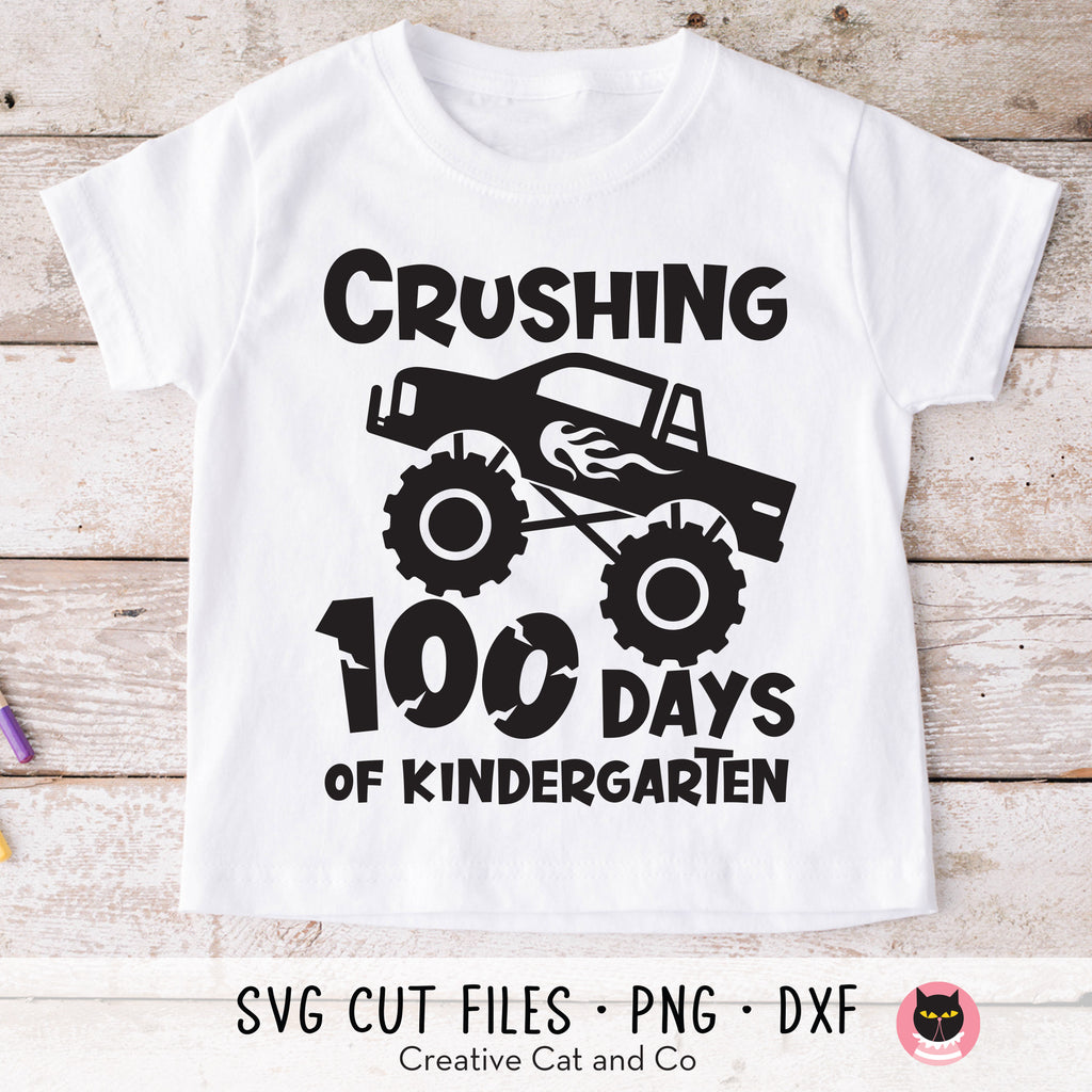 Crushing 100 Days of Kindergarten SVG cut file for Cricut. Make a cool t-shirt to celebrate 100 days of kindergarten with this great cut file. The design features a big, monster truck crushing the words "100 Days of Kindergarten". Our SVG file is easy to use and compatible with Cricut and Silhouette. DXF and PNG files are also included.