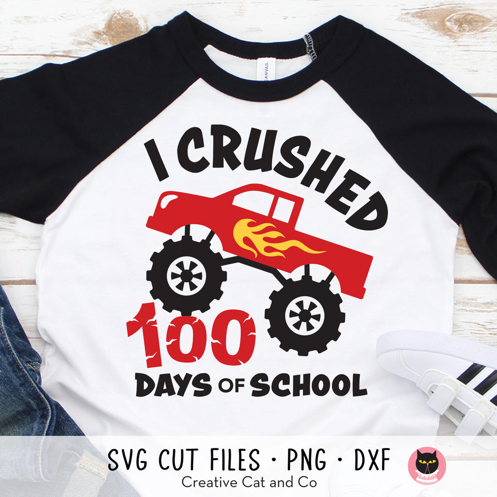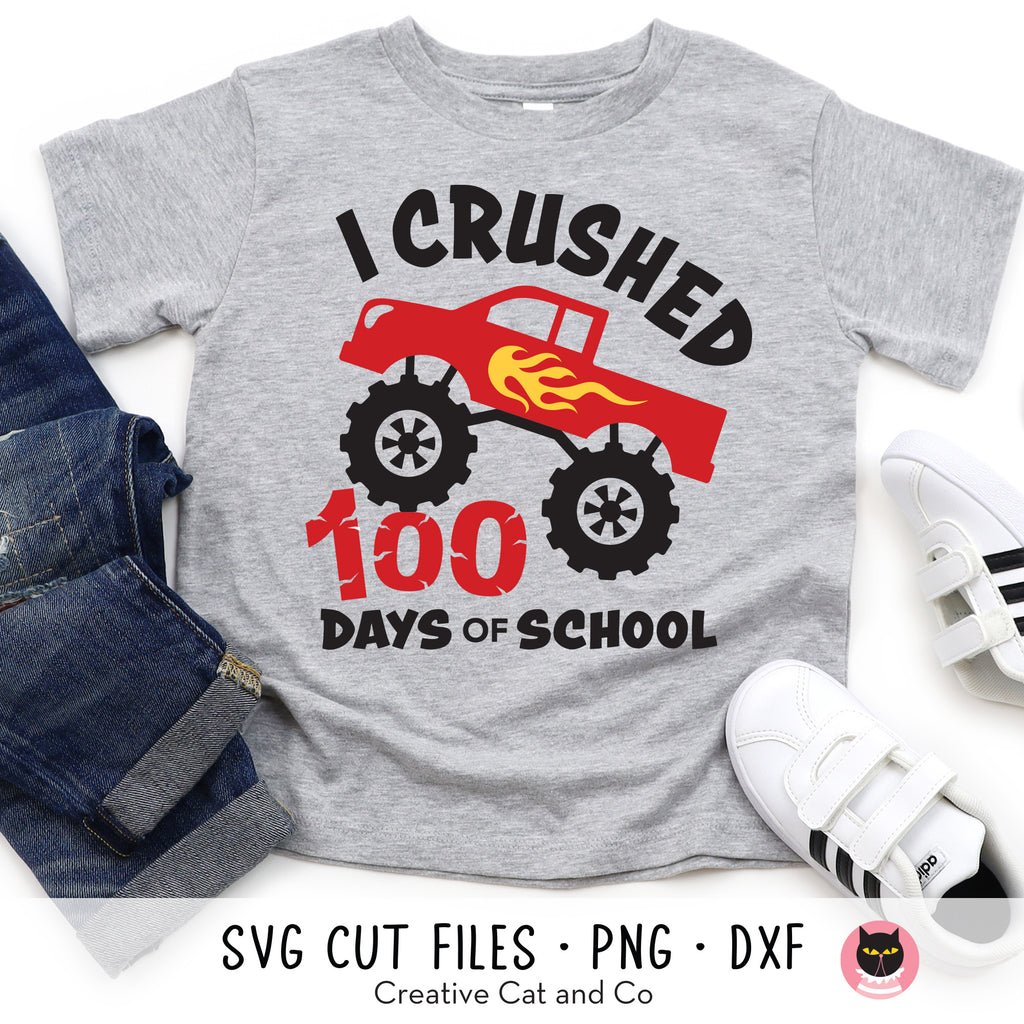 I crushed 100 days of school SVG and DXF cut files. Make a cool t-shirt for your little boy to celebrate 100 days of school with this monster truck SVG file for Cricut and Silhouette. The layered design makes it easy to cut and assemble, and the file can be resized to fit your project needs. High-resolution PNG clipart is also included and can be used for iron-on transfer.