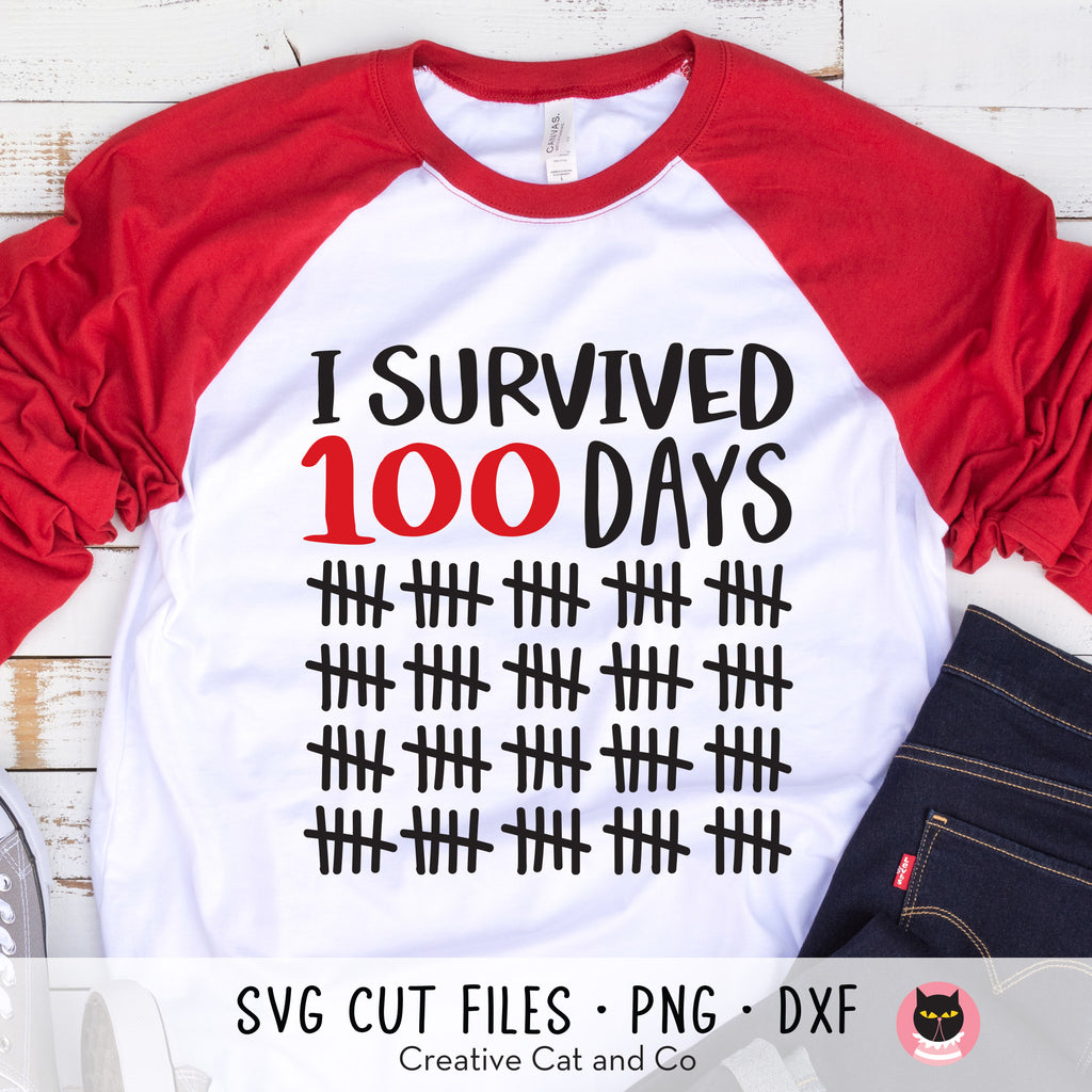 I Survived 100 Days of School SVG cut file for Cricut. Celebrate the 100th day of school with this funny SVG file. The design features tally marks with the text that reads "I Survived 100 Days". Perfect for making funny t-shirts for kindergarten, first grade, or elementary school kids and teachers. Instant download and compatible with Cricut and Silhouette. DXF and PNG files are also included.