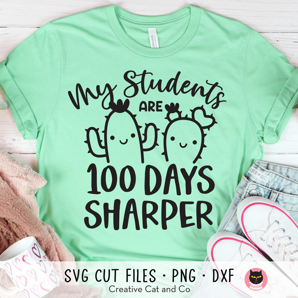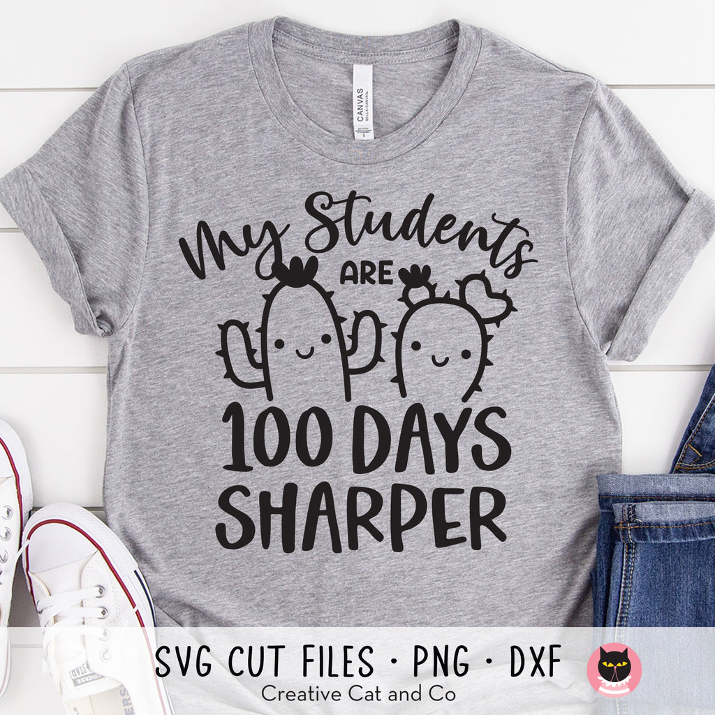 My students are 100 days sharper SVG, DXF, and PNG. It's almost the 100th day of school! Show your students how proud you are of their progress with this fun "My students are 100 days sharper" t-shirt! Compatible with Cricut and Silhouette. PNG clipart is also included and great for sublimation printing.