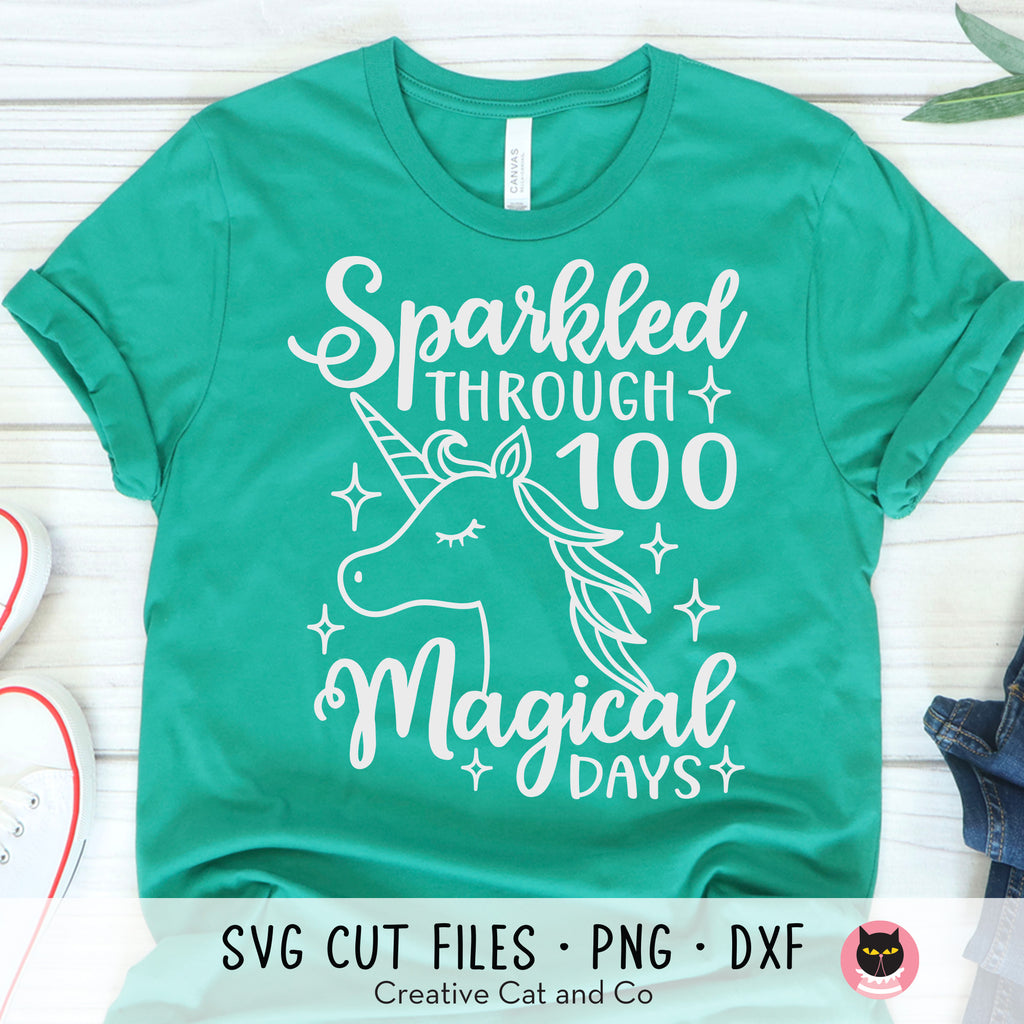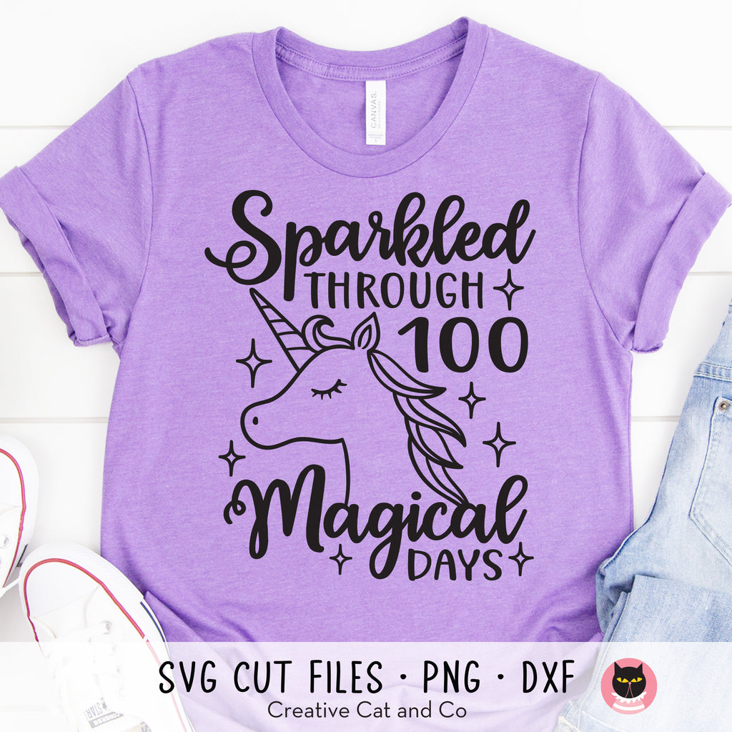 Sparkled through 100 magical days SVG and DXF cut files. Create your own 100 days of school t-shirt with this beautiful unicorn SVG design. Our easy-to-use SVG file is compatible with Cricut and Silhouette and perfect for making t-shirts, school accessories, or even teacher gifts. PNG clipart is also included.