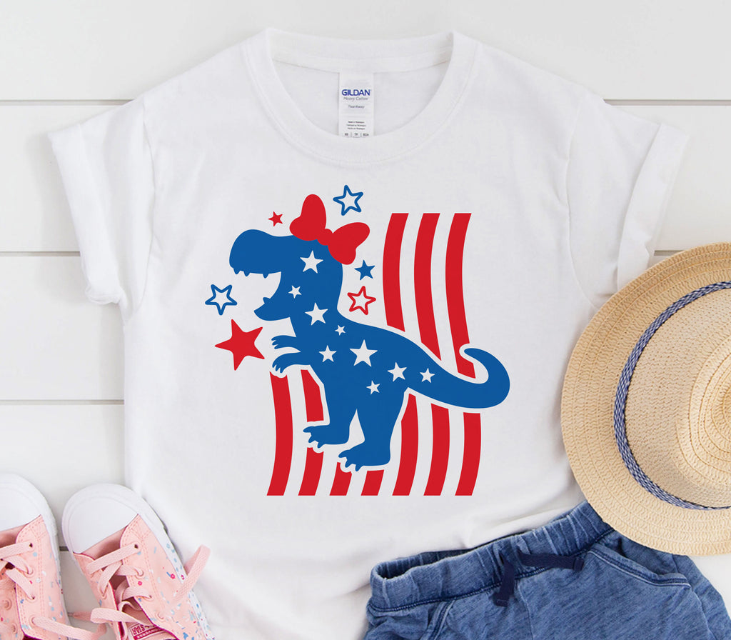 4Th of July girl dinosaur with bow SVG and DXF cut files. Make an awesome t-shirt for the coming Independence day with this adorable girl dinosaur with bow and USA flag stars and stripes SVG. Our cut files are compatible with Cricut and Silhouette. PNG clipart also included.