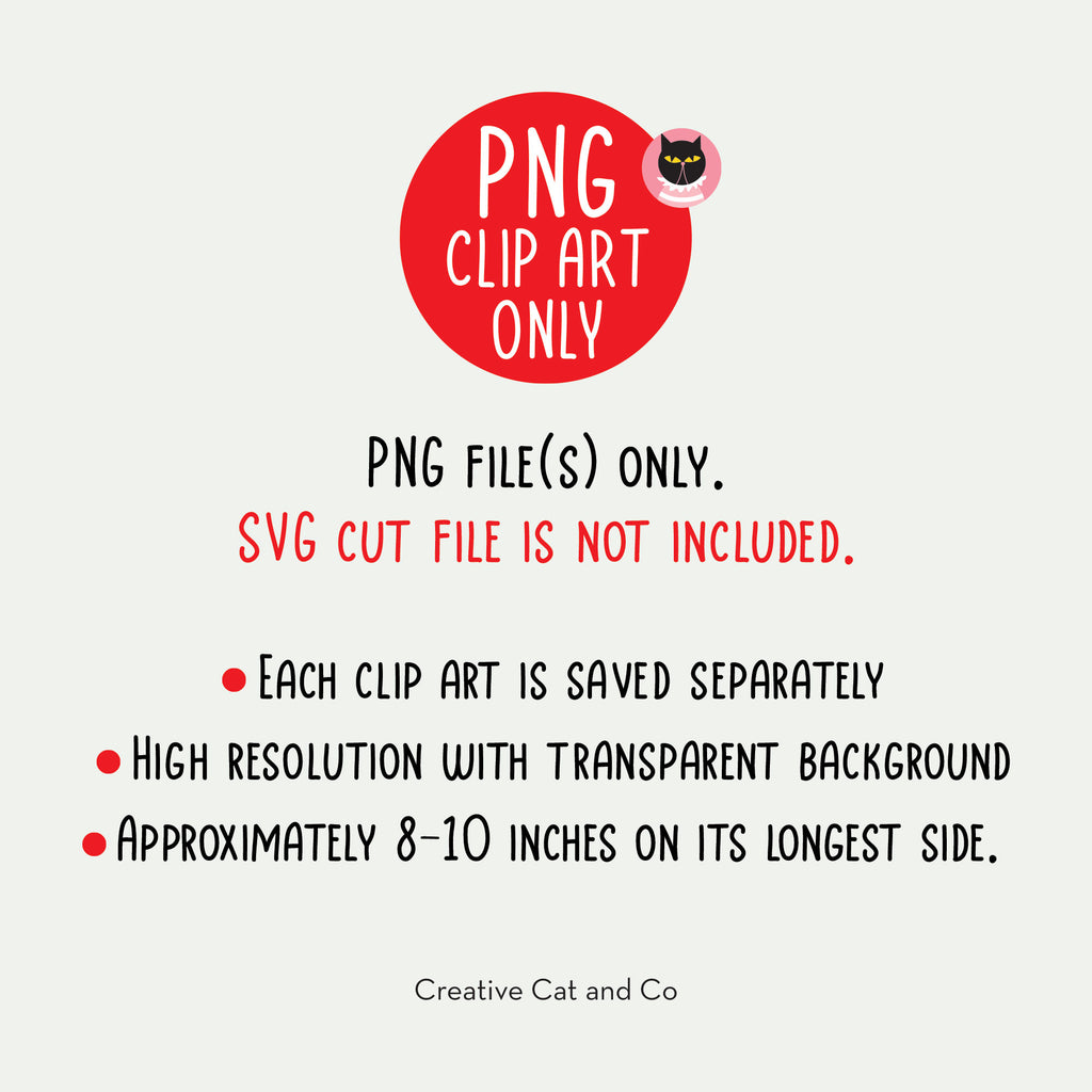 PNG Clip Art – High-resolution (300 dpi) images, approx. 8”–10”, with a transparent background. Great for print projects or web design. You can also use PNG in Print then Cut mode for iron-on transfers or stickers.