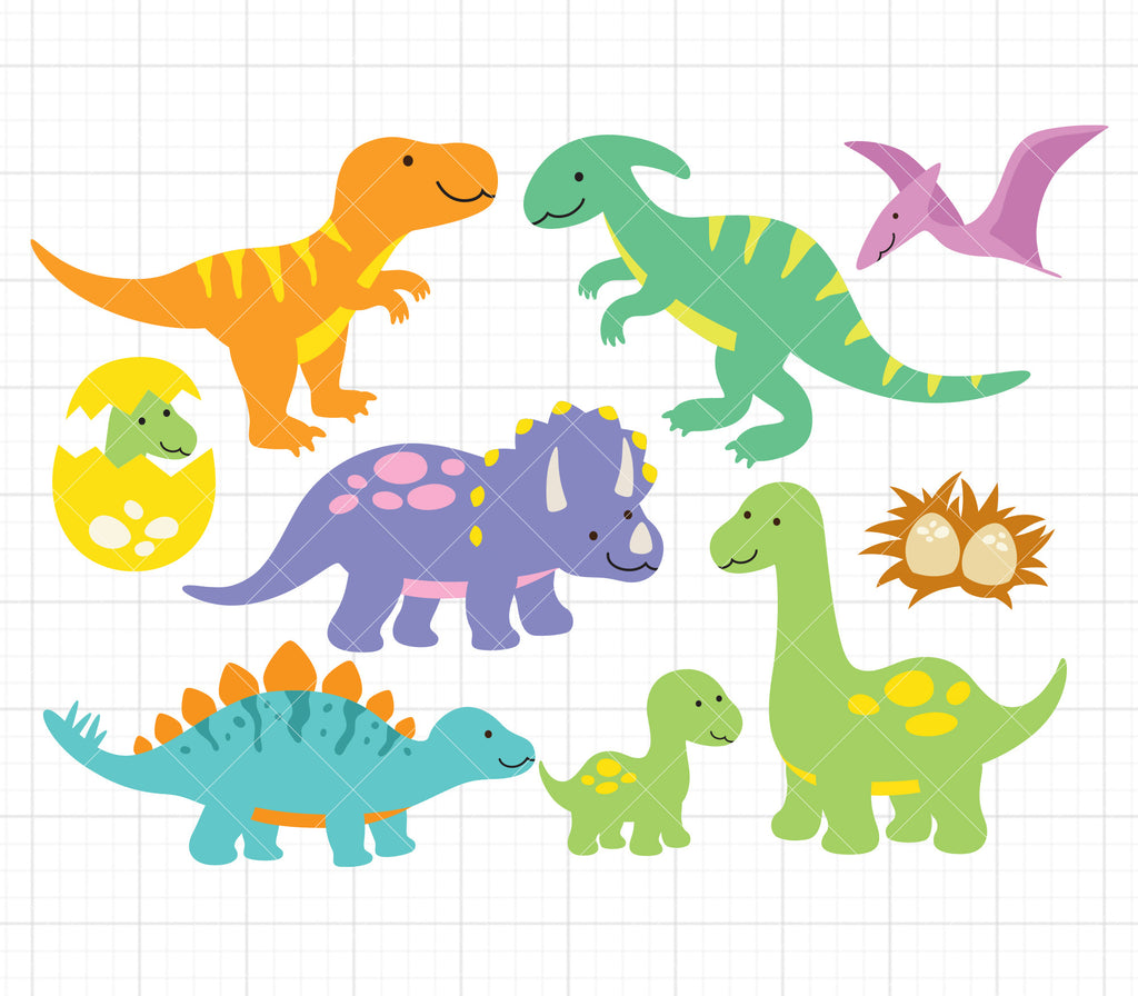 Cute baby dinosaurs SVG and DXF cut files. Set of dinosaurs including Stegosaurus, Brontosaurus, Velociraptor, Triceratops, Tyrannosaurus rex, Pterosaurs, and dinosaur eggs. SVG files are layered for easy color separation and compatible with Cricut and Silhouette. Great for making vinyl for t-shirts, accessories, and decals. High resolution PNG clipart also included.