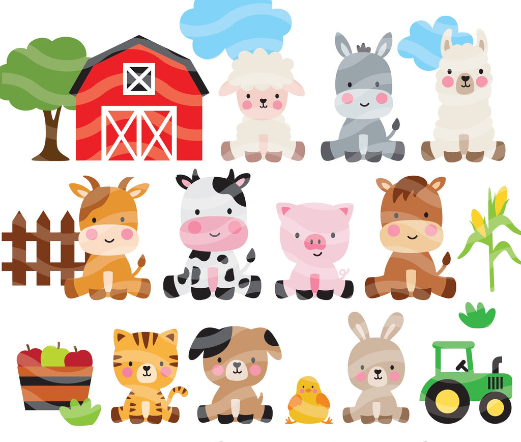 Cute sitting farm animals bundle in SVG, DXF, and PNG. The set includes a cow, sheep, donkey, alpaca or llama, horse, pig, goat, cat, dog, chicken, and rabbit.