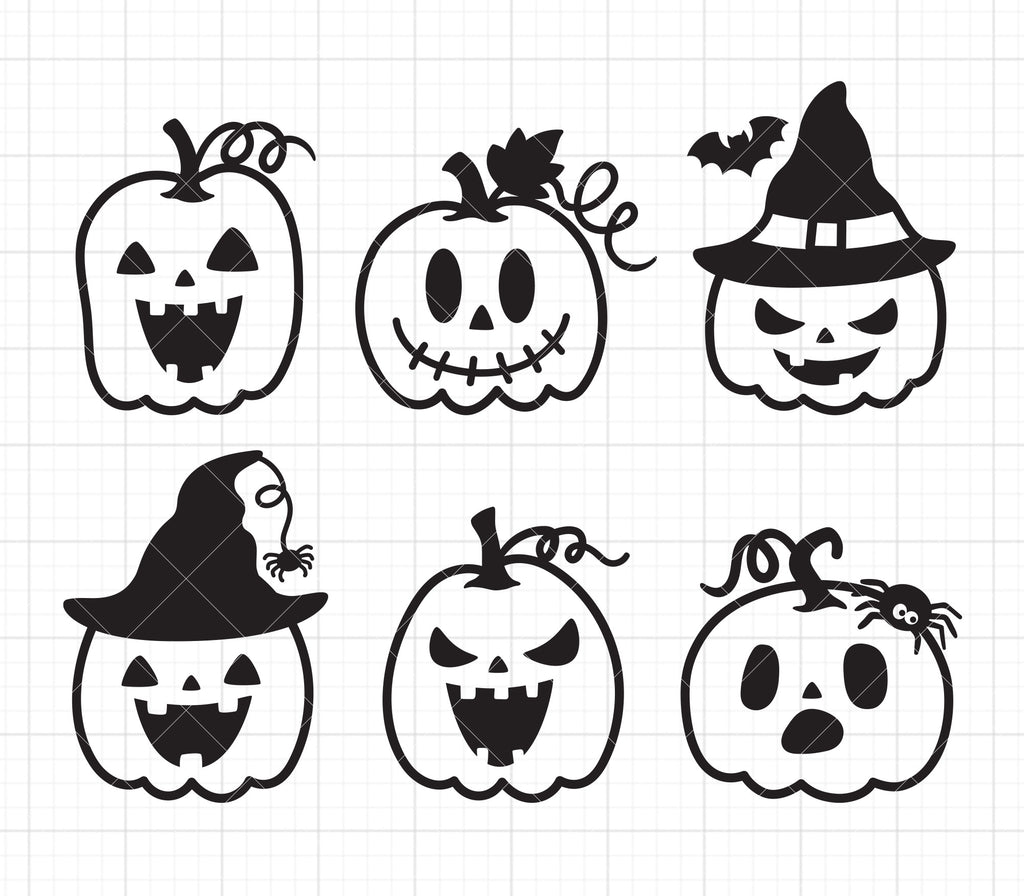 - Jack-O’-Lantern Drawing SVG PNG DXF Clipart Set | Black & White Pumpkins with Faces, Spider & Witch Designs