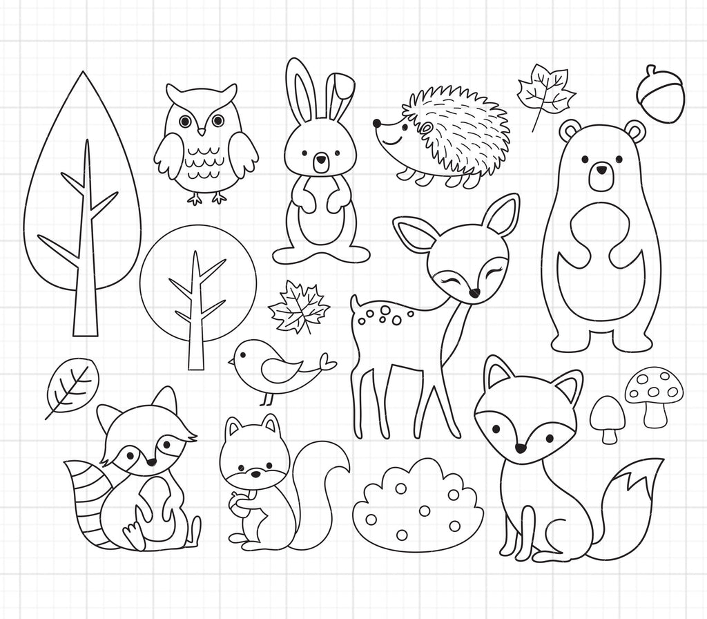 Outline woodland animals including bear, deer, rabbit, hedgehog, owl, raccoon, squirrel fox Svg, Dxf, and Png. Forest animal line art for coloring or digital stamp. Files are compatible with Cricut, Silhouette, and other cutting machines and great for making t-shirt and decal vinyl. PNG clipart with transparent background is great for making coloring pages or cards for kids.