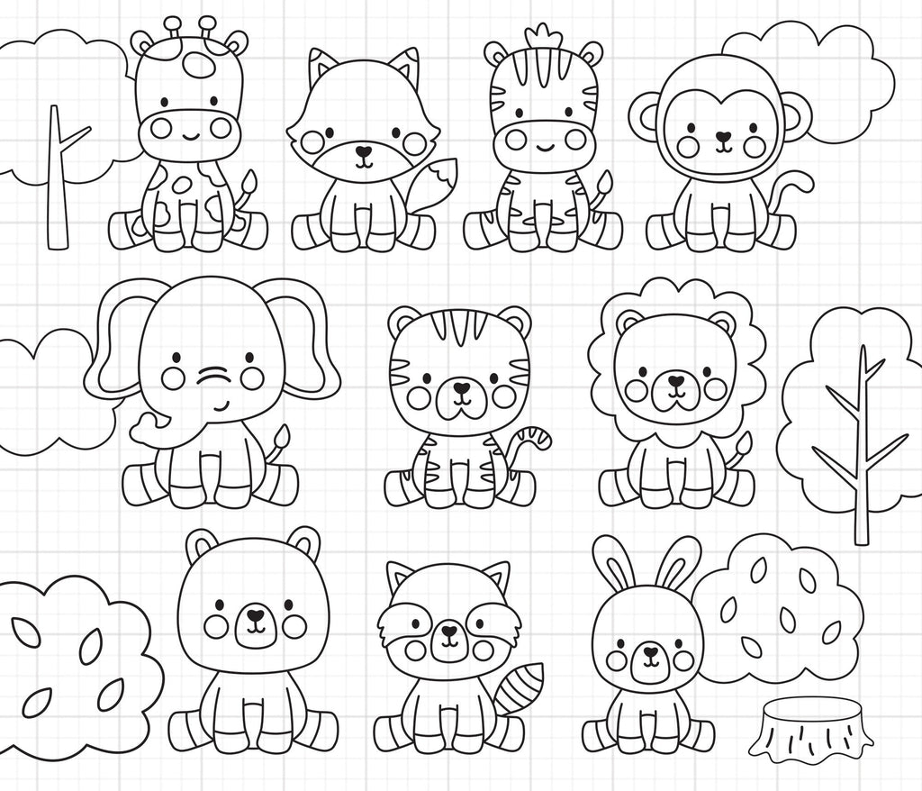 Wild forest animal outlines SVG, DXF, and PNG bundle. The set includes a lion, tiger, zebra, giraffe, fox, monkey, elephant, bear, raccoon, rabbit, trees and bushes. Compatible with Cricut and Silhouette cutting machines. Great for making digital stamps or coloring pages for kids. High resolution PNG clipart is also included.