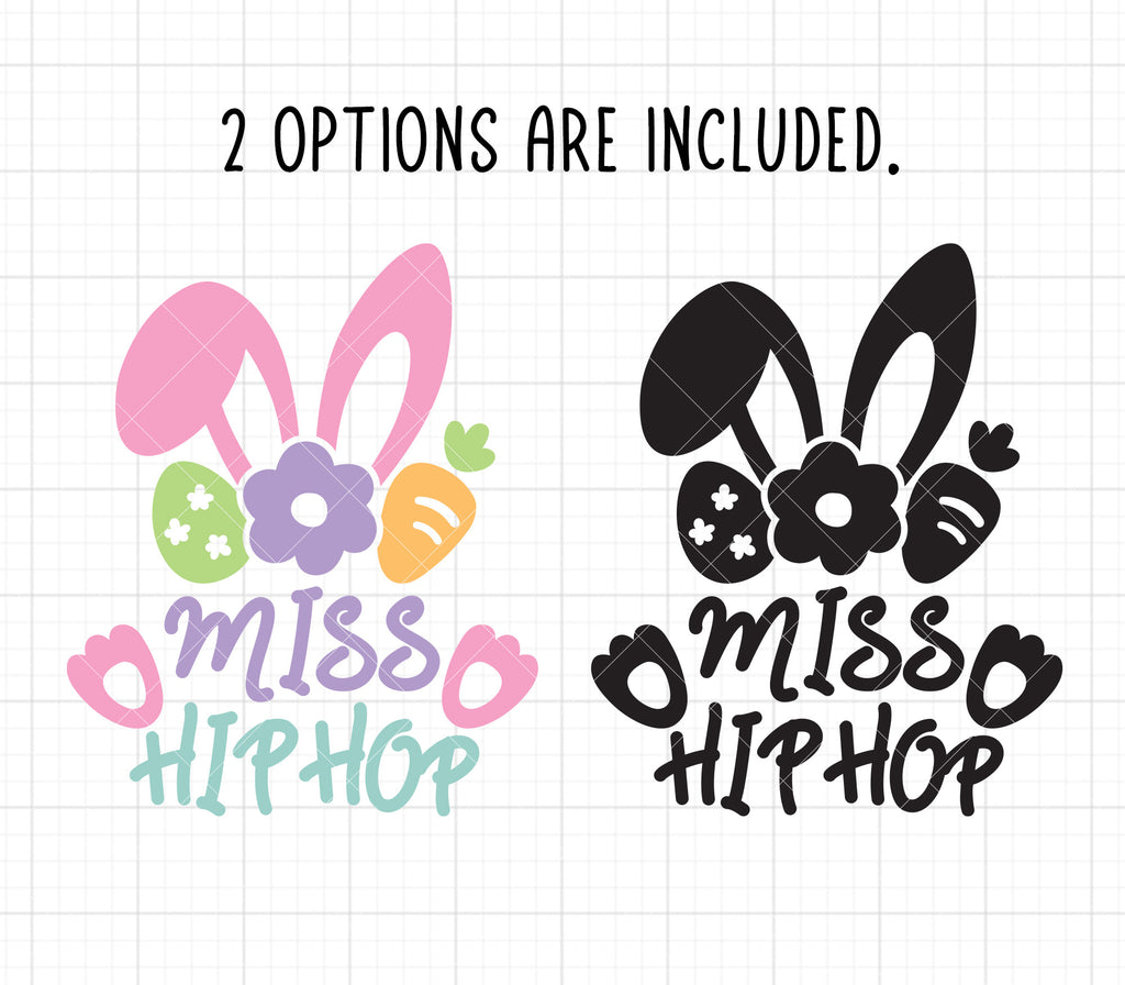 Miss hip hop SVG and DXF cut files. Make cute outfits this Easter with this miss hip hop girl Easter bunny SVG. The design features bunny ears with a flower, an Easter egg and carrot, and the word "Miss Hip Hop". The SVG file is layered for easy color separation and will make great t-shirt vinyl. PNG clipart also included.