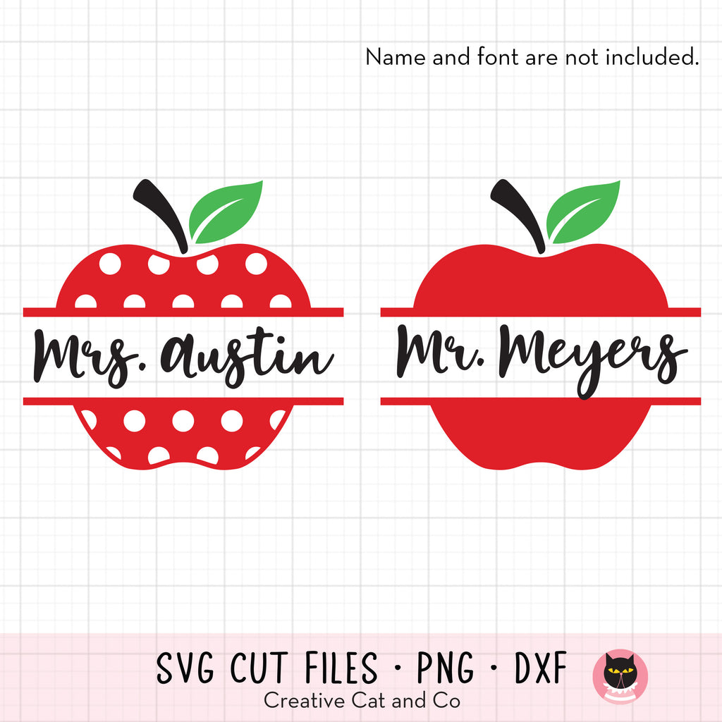 Red apple split name frame SVG and DXF cut files. Make homemade gifts that can be personalized for any teacher with this cuttable apple split frame SVG. Solid apple and polka dot patterned apple are included. The SVG file is layered, ready to cut, and will make great vinyl for mugs, tumblers, tote bags, and other accessories. Compatible with Cricut and Silhouette cutting machines.