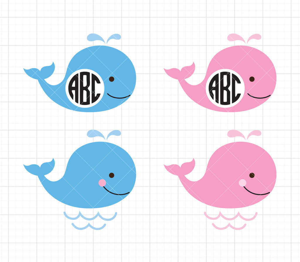 Whale and whale monogram frame SVG files for Cricut and Silhouette. The cute whale design set includes full body and monogram frame versions. High-resolution PNG clipart also includes pink and blue whales.