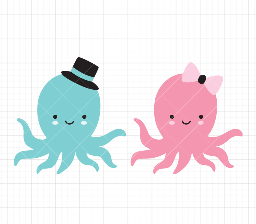 Make cute DIY projects with these two baby boy and girl octopuses SVG files for Cricut and Silhouette. The set includes a baby boy octopus with a little top hat and a baby girl octopus with a pink bow. Our SVG files can be used on adhesive vinyl, heat transfer, and t-shirt vinyl, or any other cutting surface. DXF and PNG clipart with a transparent background also included.