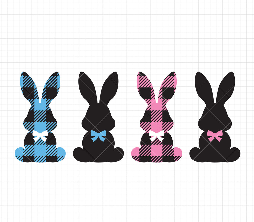 Set o 4 bunny rabbits with buffalo plaid pattern and simple silhouette shape SVG and DXF cut files. Compatible with Cricut and Silhouette. The SVG file is layered for easy color separation and great for vinyl cutting. High resolution PNG clipart also included.