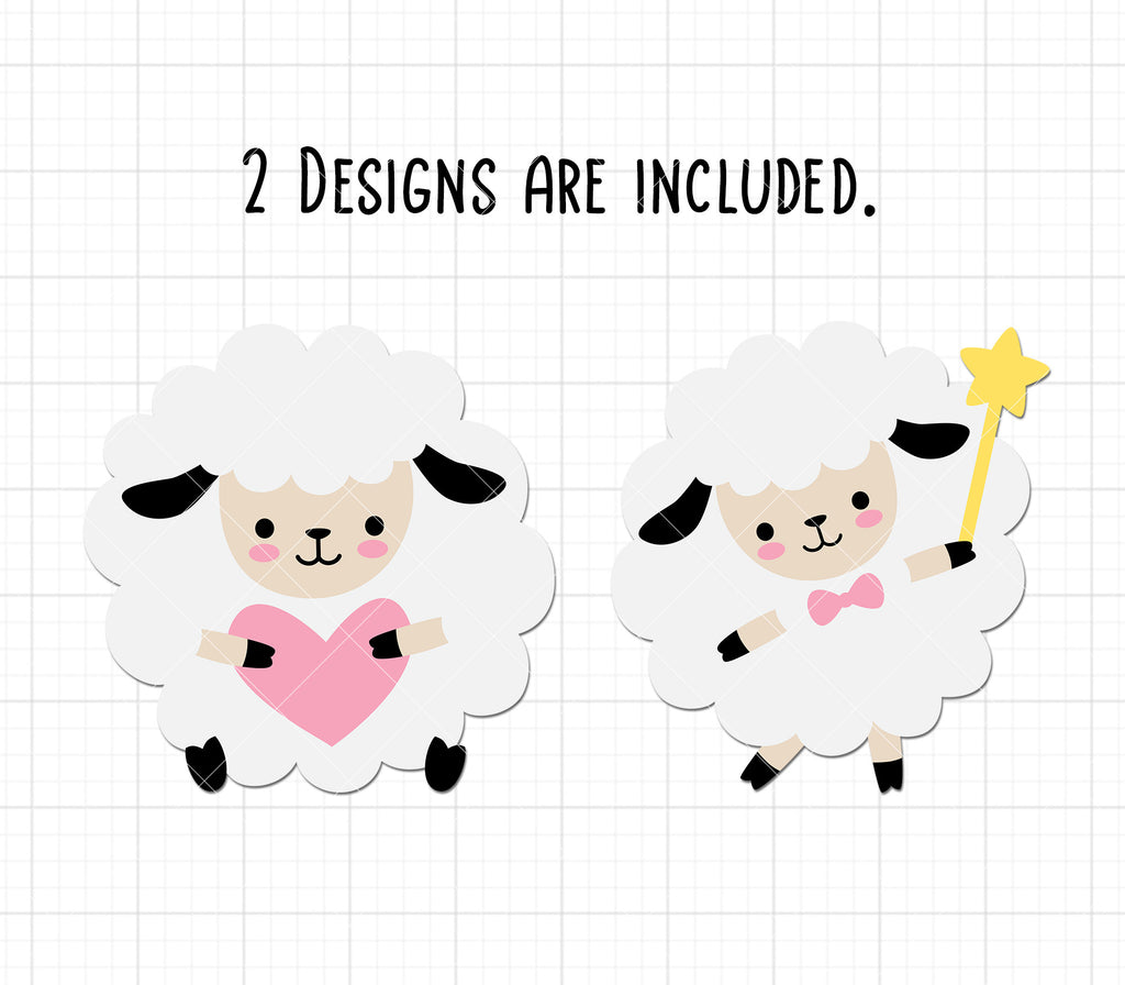 Cute baby sheep SVG, DXF, and PNG clipart. This set includes 2 adorable designs of a sheep holding a star wishing wand, and a sheep holding a pink heart. Our SVG files are layered, ready to cut, and will make great vinyl for t-shirts, tote bags, and other handmade craft items.