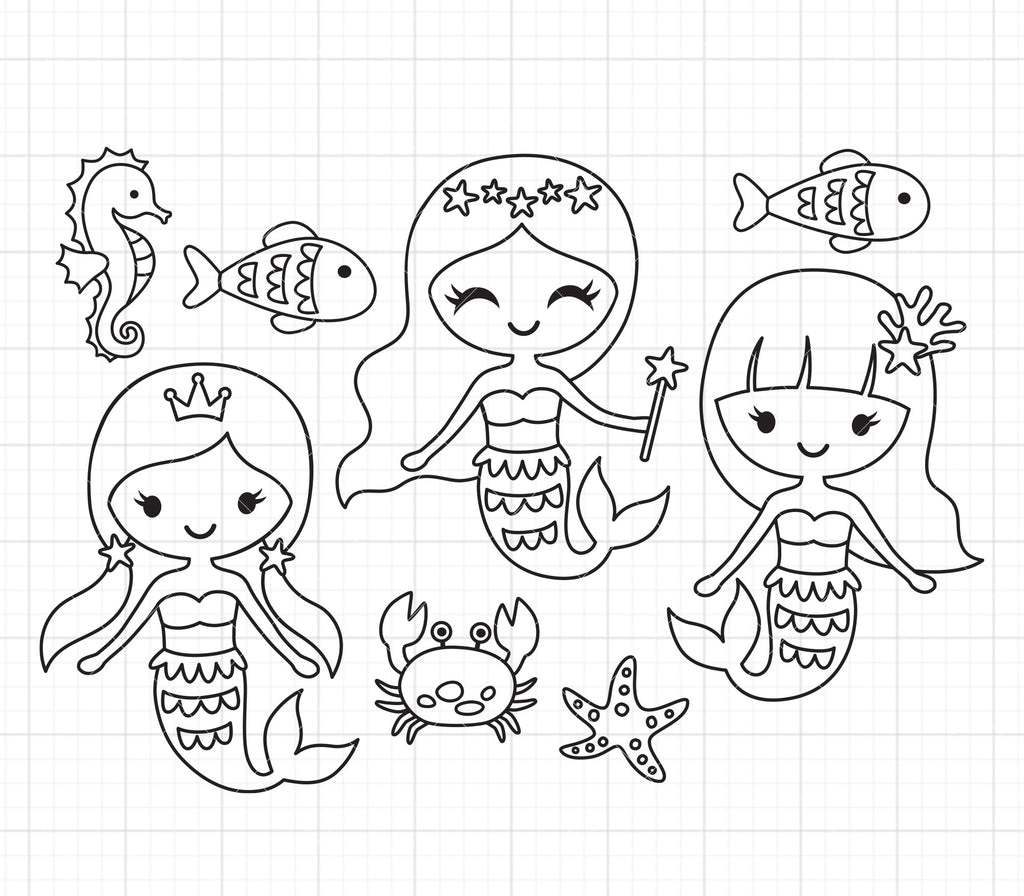 Outline mermaids and sea animals SVG and DXF cut files. Make fun coloring crafts for any party with this adorable set of mermaids and friends including fishes, seahorse, crab, and starfish SVG cut files. Compatible with Cricut and Silhouette and will make a great t-shirt and decal vinyl. PNG clipart with transparent background is also included and great for making coloring pages or cards for kids.