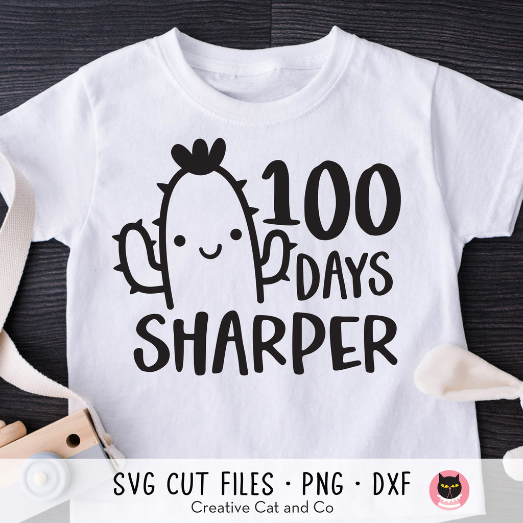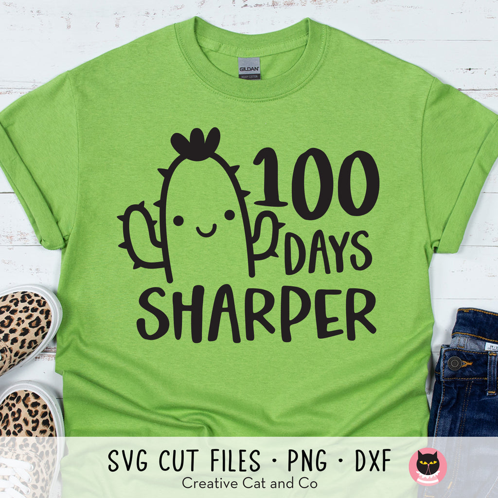 100 Days sharper SVG, DXF, and PNG. Make a perfect t-shirt to celebrate the 100 days of school with this easy-to-use, layered SVG file. This design includes a cute cactus with the text that reads "100 Days Sharper". Compatible with Cricut and Silhouette.