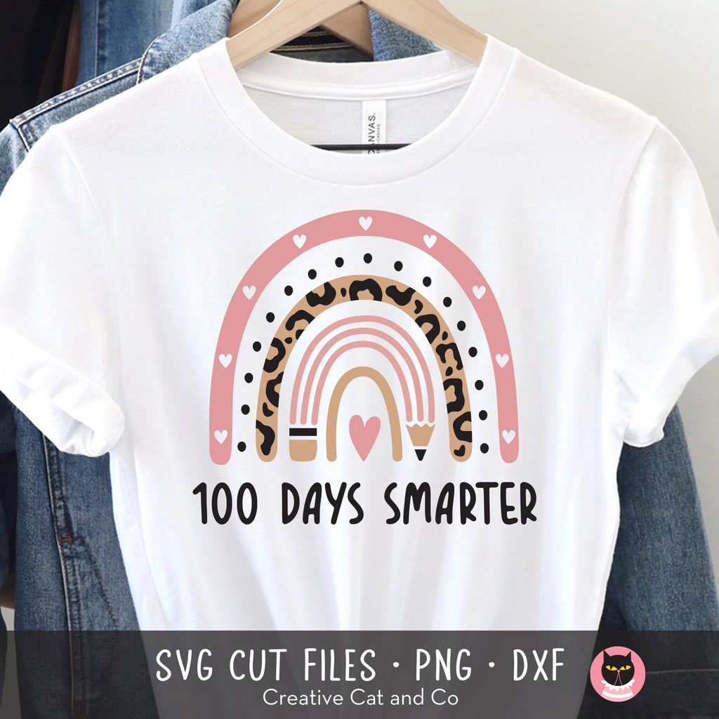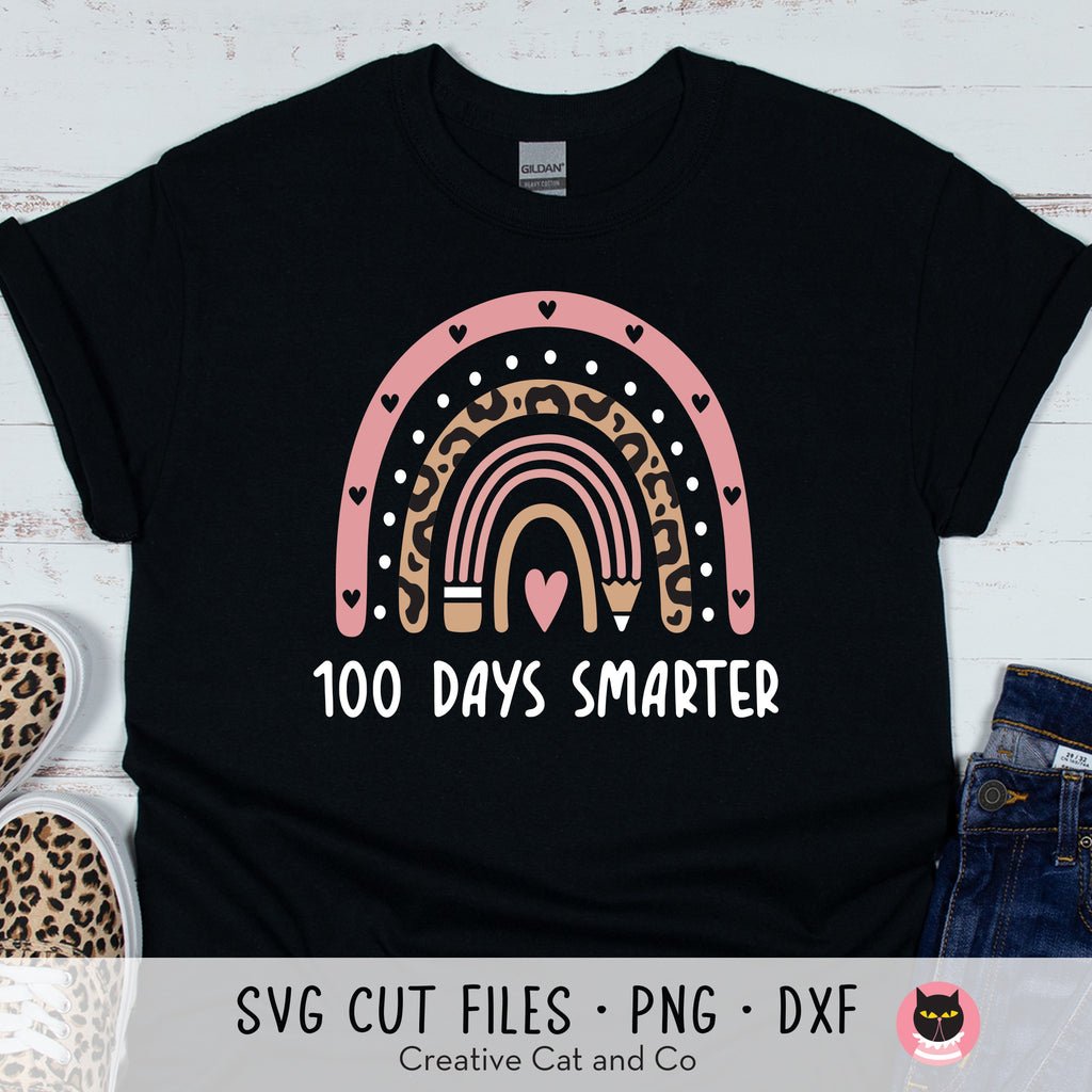 100 Days Smarter SVG, DXF, and PNG files. This easy-to-use, layered SVG file for Cricut is the perfect way to make 100 days of school t-shirts, coffee mugs, or teacher gifts! This design features a nude, pink, and leopard print rainbow with the text that reads "100 Days Smarter". Compatible with Cricut and Silhouette. PNG clipart is included and great for sublimation printing.