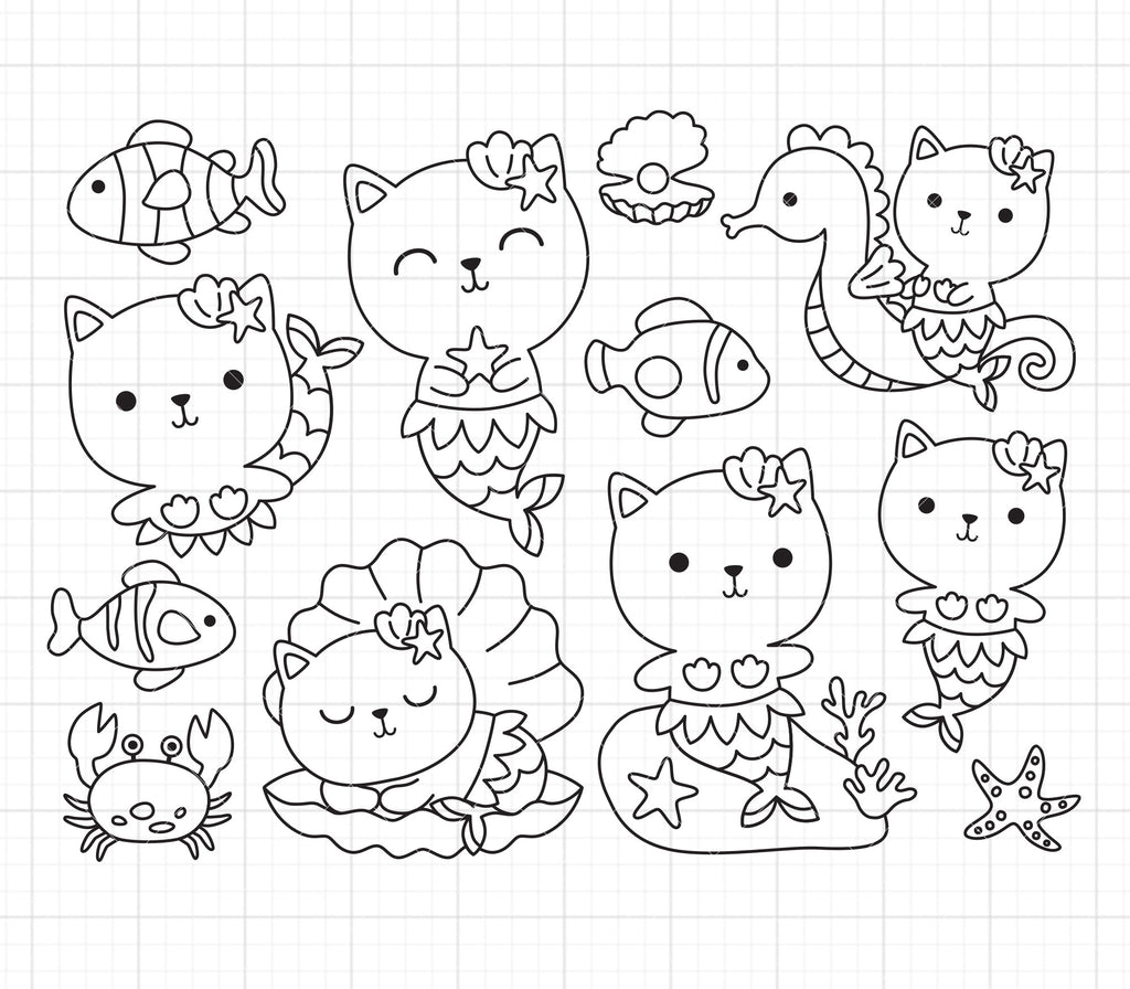 Cute cat mermaid and sea animals outline SVG and DXF cut files. Make fun craft projects or coloring pages for kids with this adorable set of "Mermeow" a half cat half mermaid and other sea animal friends SVG. Compatible with Cricut and Silhouette. High resolution PNG clipart is included. Great for kid coloring, digital stamps, etc.