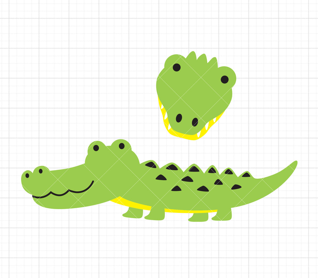 Green crocodile or alligator SVG and DXF. This cartoonish style is suitable for kids and includes full body and head only crocodile. This SVG design is layered, ready to cut, and will make great vinyl for kid t-shirts, water bottles, tote bags, and more! PNG clipart with a transparent background also included.