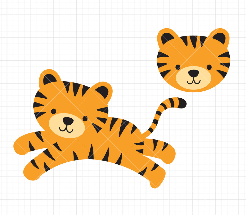 Cute jumping tiger SVG cut file for Cricut and Silhouette. Make cute crafts with this cuttable jumping tiger SVG. Tiger face only SVG is also included. High-quality SVG file with layers for easy color separation. Great for making vinyl for t-shirts, water bottles, window decals, etc. High-resolution PNG clip art with transparent background is also included and great for scrapbooking, card making, and paper crafting.