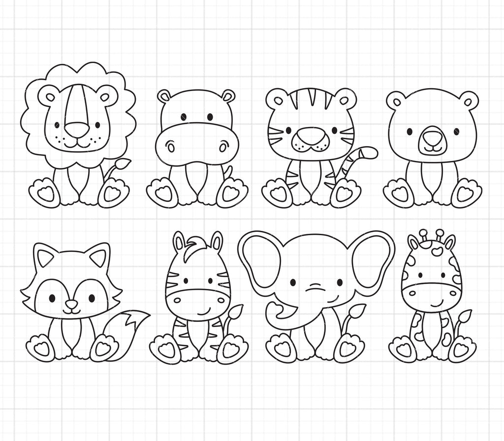 Outline wild animals set for coloring SVG and DXF cut files. Outline safari animals including lion, tiger, hippo, bear, fox, zebra, giraffe, and elephant. Compatible with Cricut and Silhouette and will make a great t-shirt and decal vinyl. High-resolution PNG clip art with a transparent background is also included and great for making kid coloring pages or cards.