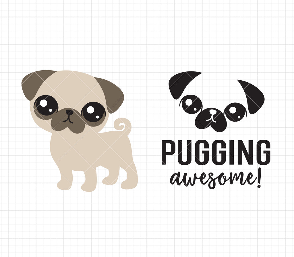 Make great gifts for any pug lover with this adorable pug SVG and DXF cut files. The set includes a full-body pug and a silhouette pug face with the text 'Pugging Awesome'. Our SVG is layered for easy color separation and will make great vinyl for t-shirts, mugs, tote bags, and more! High-resolution PNG clip art also included.